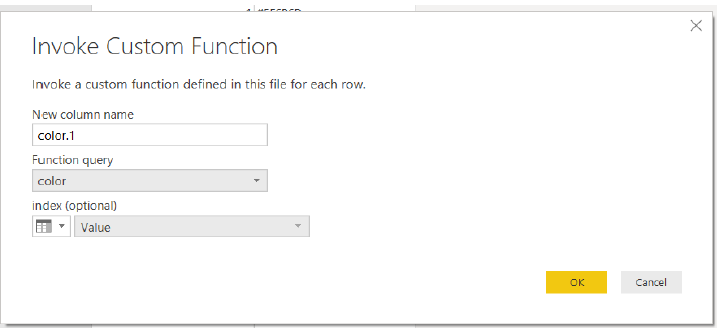 4) Use ‘Invoke Custom Function’ to call function ‘color’ and select index = Value.
