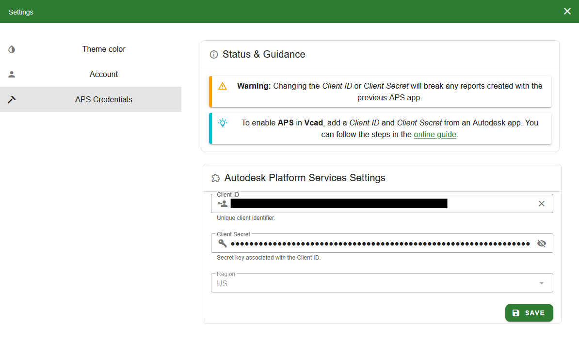 In the Vcad application settings, you should already see your Autodesk Platform Services connection configured. This connection enables the APS viewer, allowing you to load and visualize a wide range of BIM file formats in your reports.