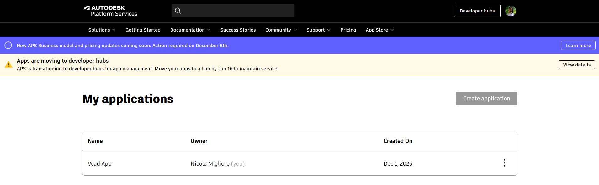 Once this is done, your Vcad application will be aligned with Autodesk’s new HUB-based APS architecture and your new APS Developer Hub will display the application previously used by Vcad.