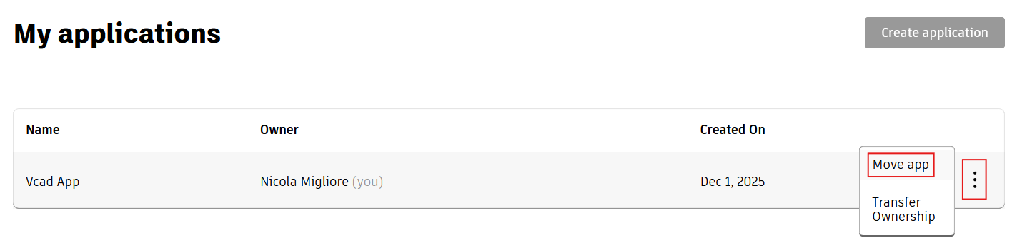 You will now see your list of existing APS applications. You should eventually move all of them into a Developer Hub, but for Vcad, you only need to migrate the application currently used by your Vcad installation.