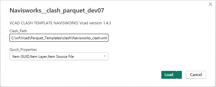 Quick_Properties: is the comma-separated list of Quick Properties used to export the Clash file. The default values presented by the template are: Item Guid, Item Layer, Item Source File